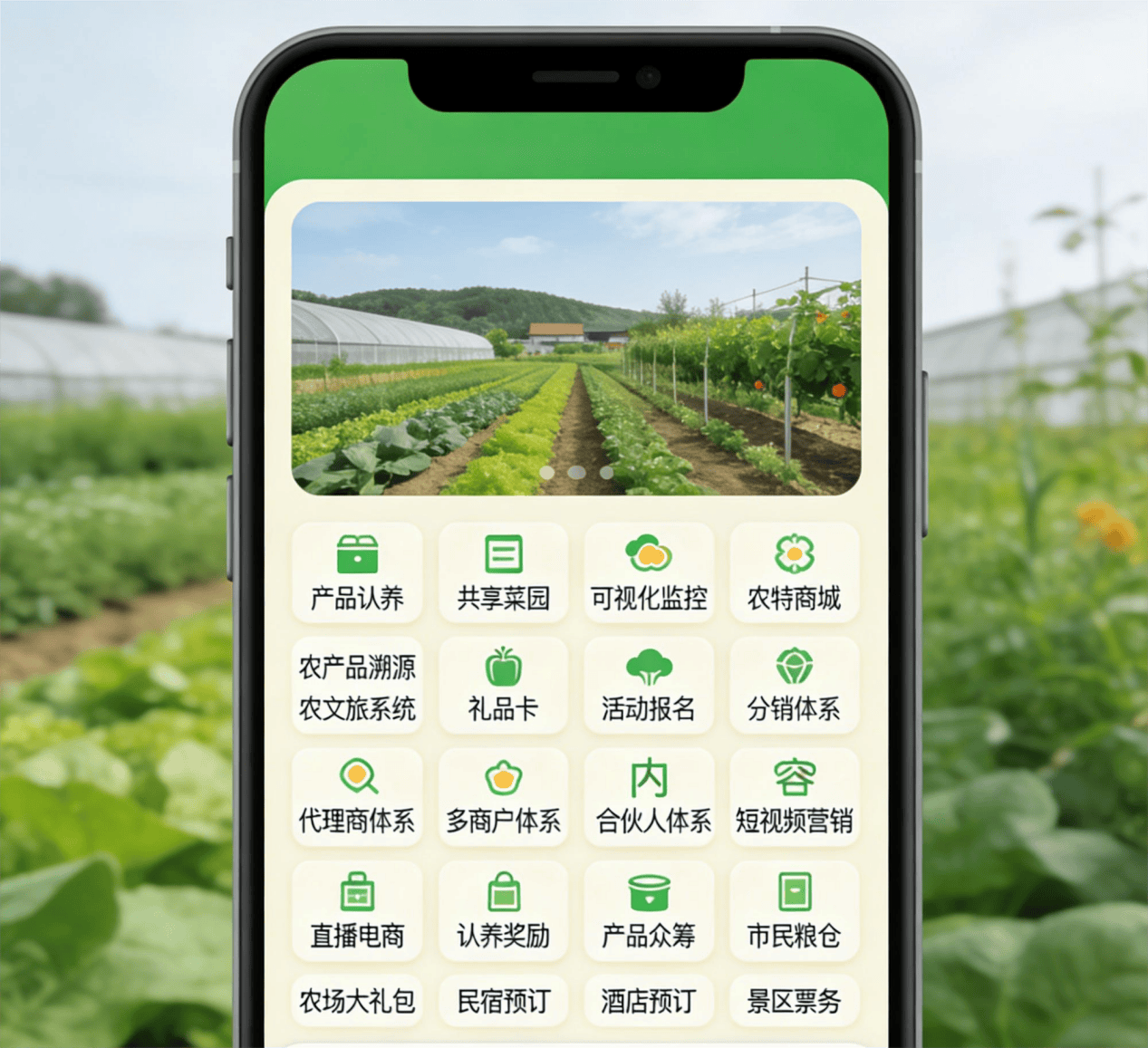 分销体系、代理商体系、多商户体系、合伙人体系四大体系并行,搭配内容营销、短视频营销、直播电商功能,助力运营者快速拓客、扩大影响力;认养奖励、产品众筹、市民粮仓、农场大礼包等功能,进一步提升用户参与度与复购率,丰富盈利渠道。