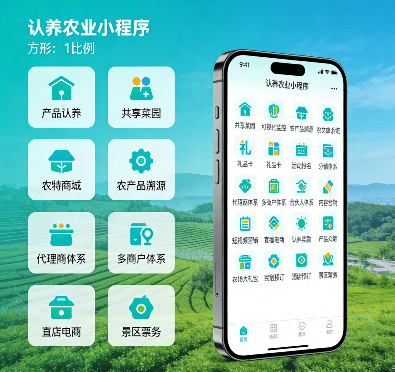 4. 营销与盈利拓展:搭建完善的营销体系,涵盖分销、代理商、多商户等模式,搭配短视频、直播电商模块,配合认养奖励、众筹活动,助力快速拓客锁客;延伸农文旅、礼品卡、活动报名等模块,丰富盈利场景,实现“农业+文旅”融合发展。