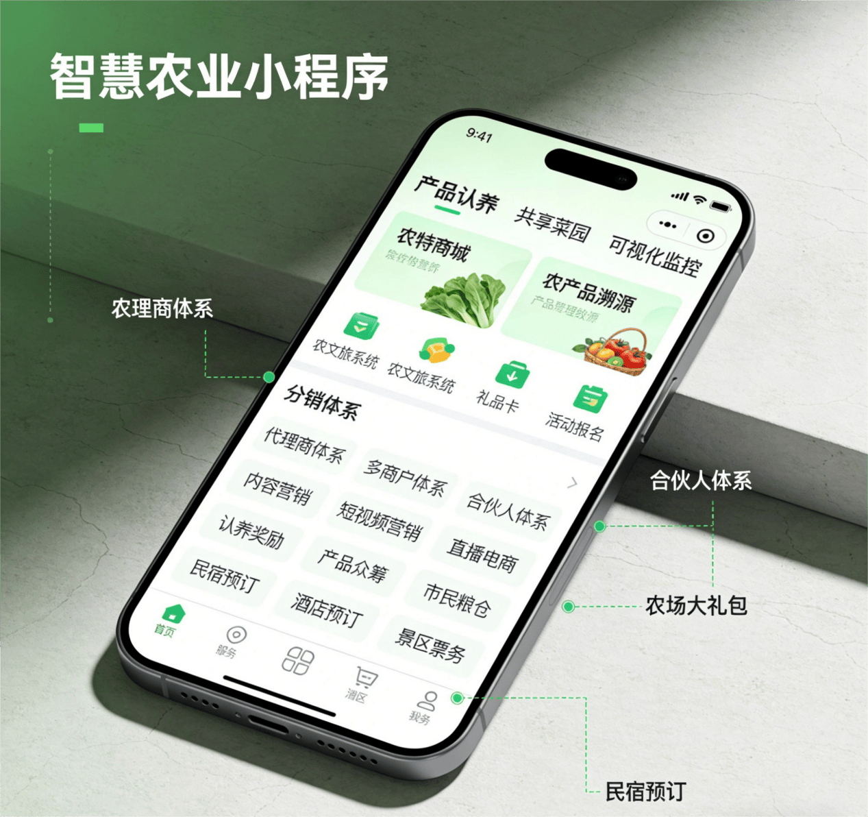 营销裂变板块,整合分销体系、代理商体系、合伙人体系三大核心模式,支持多级分销、代理商管理、合伙人分红,助力秦皇岛农业主体快速裂变客户、拓展市场,降低获客成本;同时配套认养奖励、产品众筹、市民粮仓、农场大礼包等特色功能,丰富运营玩法,提升用户粘性与复购率;